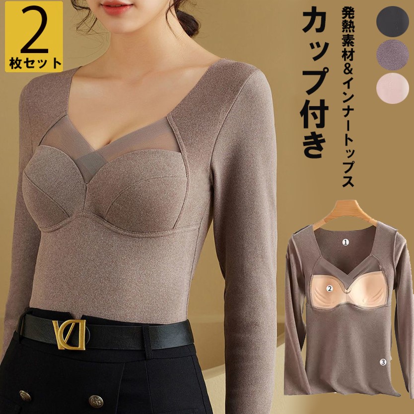 脇背中の肉感拾わずバストも綺麗に 2枚セット カップ付き ブラトップ 長袖 垂れ胸 補正 ノンワイヤー 脇肉 インナートップス 補正下着 暖かい 起毛素材 裏起毛 カットソー ルームウェア