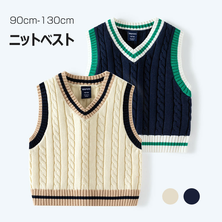 2色 キッズ ライン入り Vネック ニットベスト ベスト セーター 男の子 かわいい ケーブル編み 小学生 幼稚園 通園 通学 おしゃれ 保温 暖かい 紺 ネイビー ベージュ 90cm 100cm 1