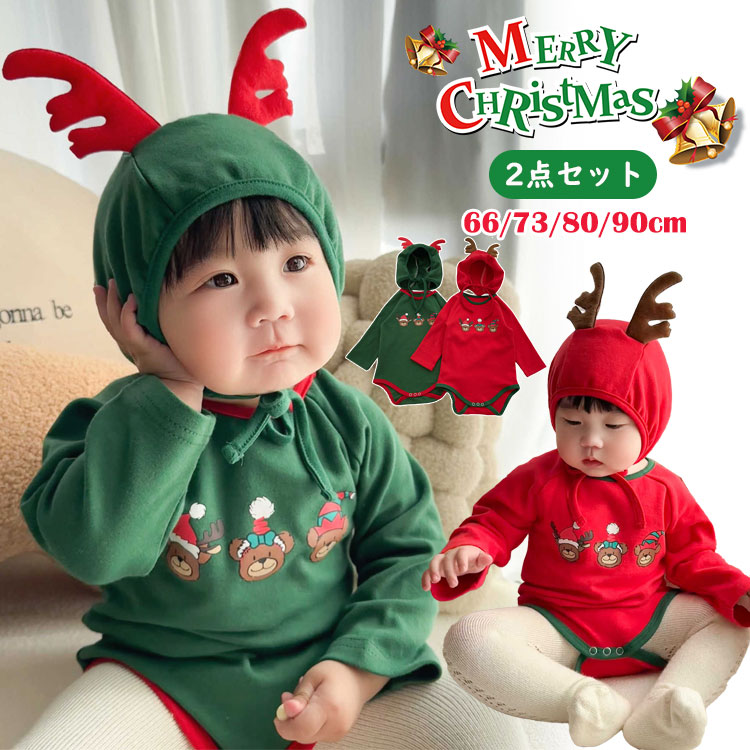 クリスマス ベビー服 ロンパース 2点セット 長袖 帽子付き かわいい トナカイ キッズ服 赤ちゃん 66 73 80 90cm 普段着 記念写真撮影 パーティー 誕生日 プレゼント ギフ