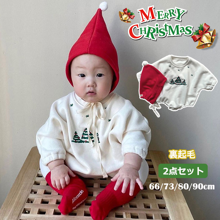 ベビー服 ロンパース 2点セット クリスマス 長袖 帽子付き 暖かい 裏起毛 キッズ服 赤ちゃん 秋冬 66 73 80 90cm かわいい サンタさん トナカイ クリスマスツリー 普段着 誕生日 プ
