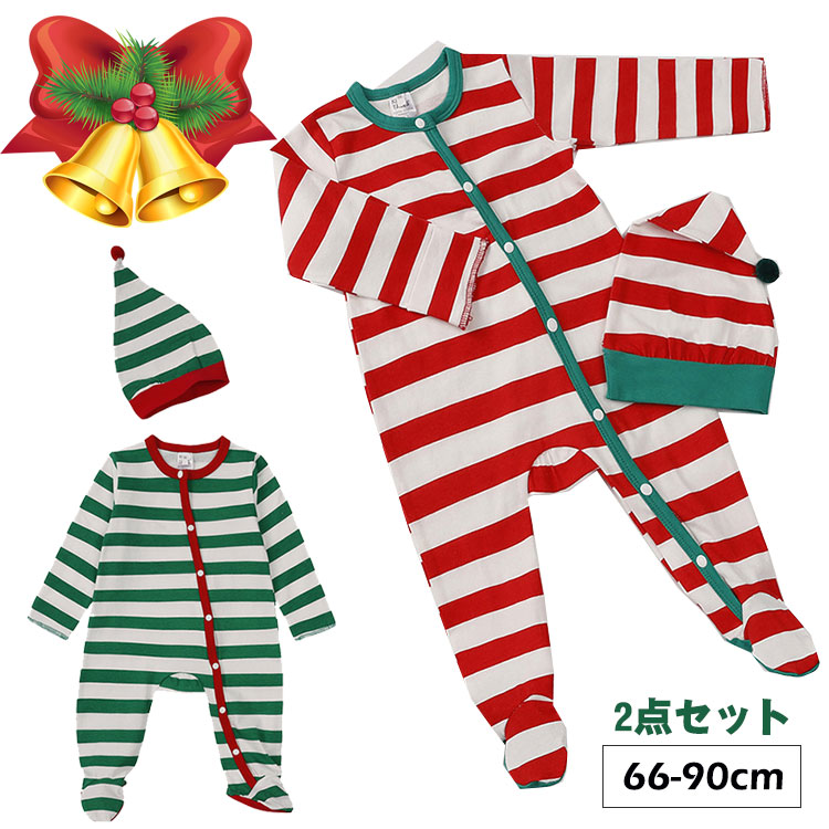 ベビー服 ロンパース 2点セット ボーダー柄 クリスマス 長袖 帽子付き ルームウェア パジャマ 赤ちゃん 66 73 80 90cm かわいい 普段着 誕生日 プレゼント ギフト レッド グリーン