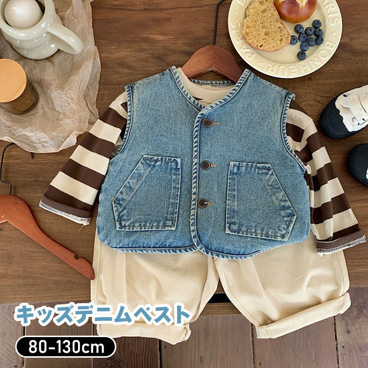 キッズ ベスト デニム 男の子 女の子 コットン 春秋 おしゃれ トップス ユニセックス こども 子供服 ベビー 赤ちゃん 幼稚園 小学生 日常着 コーディネート 80 90 100 110 120