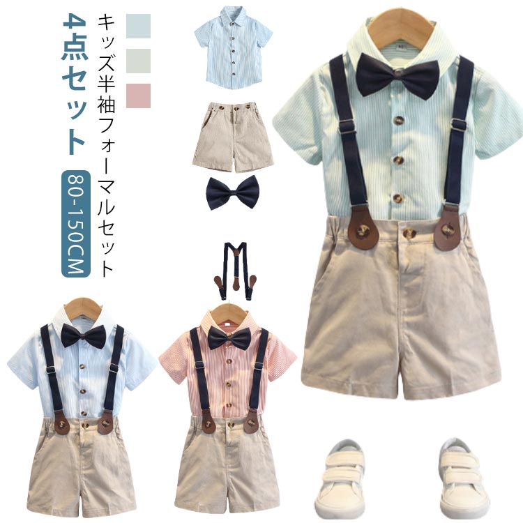 4点セット シャツ 男の子 90 子供 半袖ワイシャツ 結婚式 サスペンダー ベビー 100 ハーフパンツ 半袖 80 上下セット 子供服 110 スーツ フォーマル 120 蝶ネクタイ cm