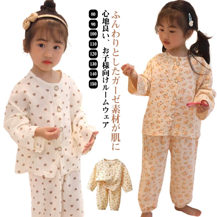前開き 綿 2点セット ルームウエア 上下セット 可愛い ベビー ガーゼ 子供 柔らか 小学生 お泊り キッズ 幼稚園 男の子 女の子 長袖 部屋着 通気性 ナチュラル おしゃれ ルームウエ コットン
