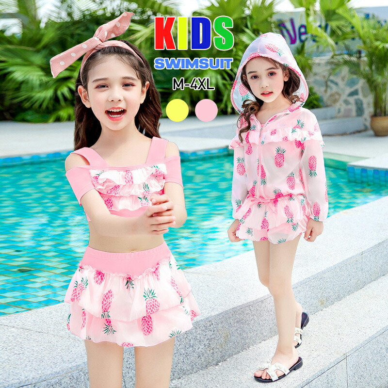 子供スクール水着 スクール水着 女の子 水着 3点セット レディース フィットネス 競泳水着 レディースキッズ フード付き ジュニア パイナップル フルーツ UVカット おしゃれ スイムウ
