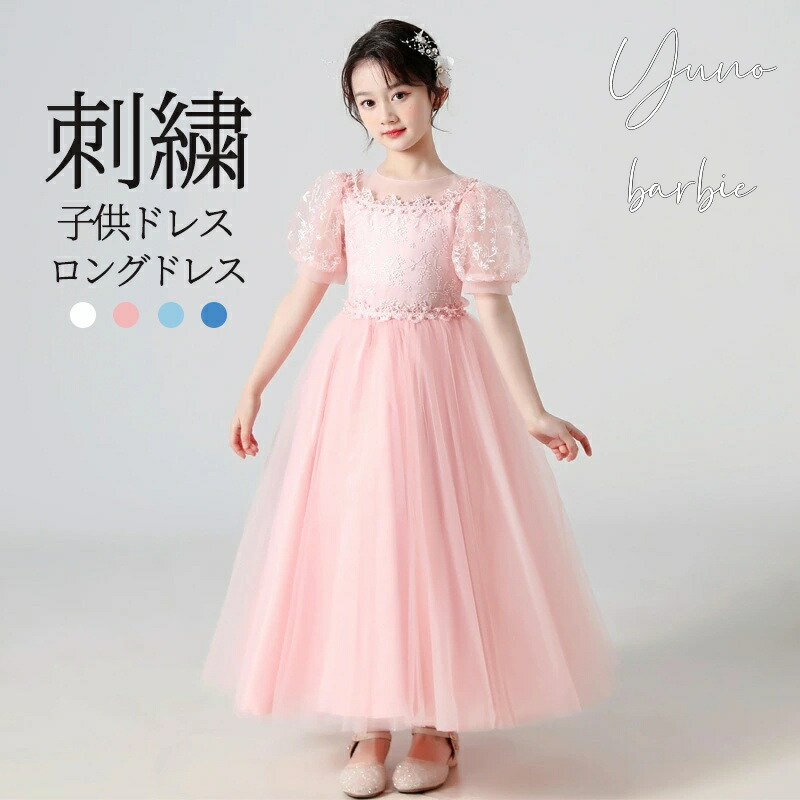 ロングドレス パフスリーブ 子供ドレス 発表会 ピアノ フォーマル 卒業式 演奏会 入園式 誕生日 ジュニア 刺繍 3-14歳