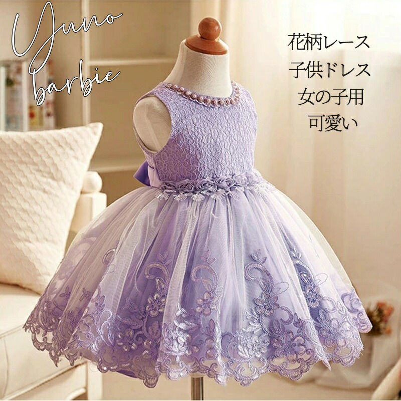 子供 ドレス ピアノ発表会 子供ドレス ワンピース 女の子 発表会ドレス ふんわり フレアスカート 花柄レース 可愛いリボン ピンク ブルー パープル サイズ100-150 フォーマル
