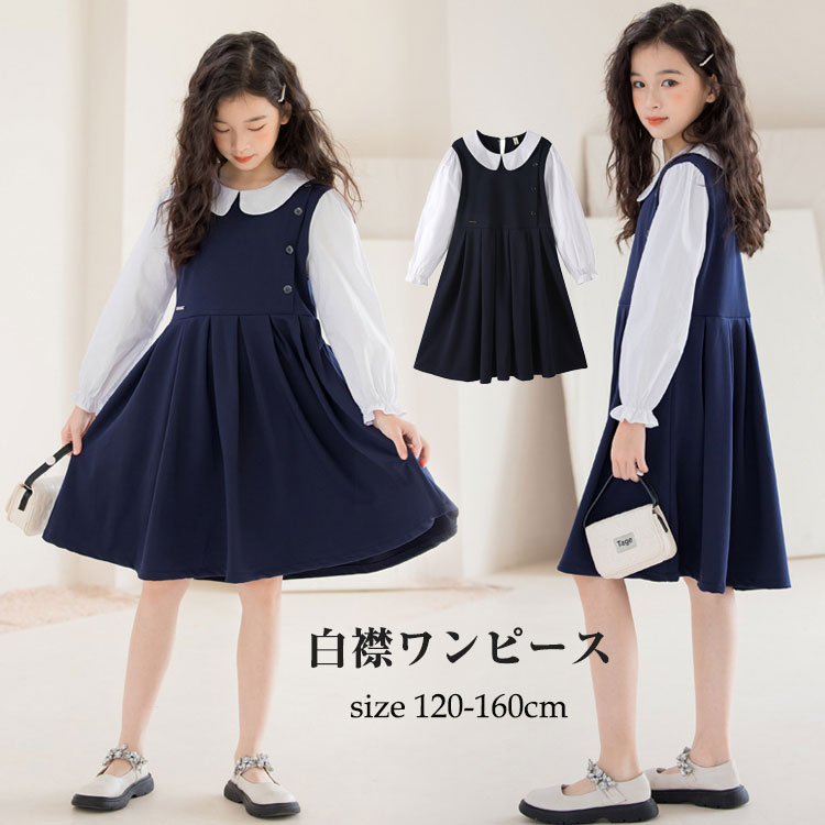 白襟 ワンピース キッズ 女の子 長袖 春秋 フォーマル ジュニア 子供服 おしゃれ フォーマルワンピース ジャンパースカート ネイビー 小学生 中学生 高校生 かわいい 誕生日 プレゼント 結婚式
