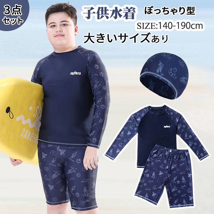 キャップ付き 3点セット 大きいサイズあり キッズ 水着 男の子 セパレート ぽっちゃり体型 ぽっちゃりさん 長袖 ゆったり太め 服 140-190