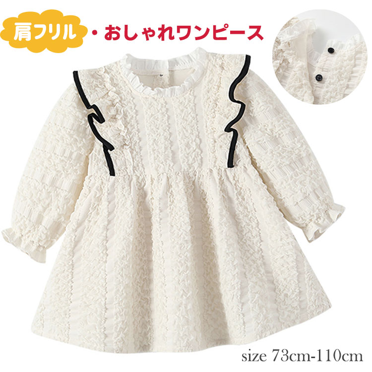 キッズ ワンピース 女の子 肩フリル 長袖 春秋 高級感 子供服 おしゃれ プリンセス ドレス レース ベビー ホワイト 73 80 90 100 110cm 幼稚園 保育園 かわいい 誕