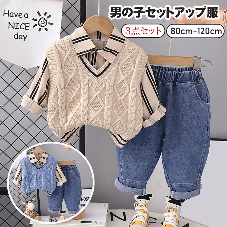 キッズ 男の子 セットアップ服 ベビー服 春秋 冬 シャツ ニットベスト デニムパンツ 上下セット おしゃれ 子供服 ファッション カジュアル 幼稚園 小学生 誕生日 クリスマス プレゼント80cm