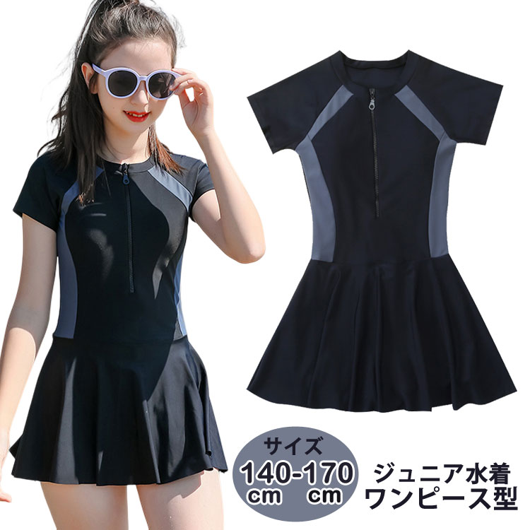 ジュニア ワンピース水着 女の子 スクール水着 キッズ 水着 子供水着 水泳 ガールズ ブラック 体型カバー スイムスカート 一体型 140cm 150cm 160cm 165cm 170cm