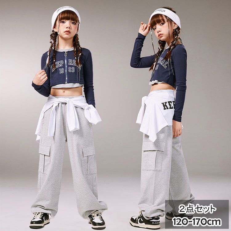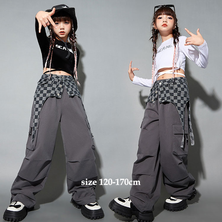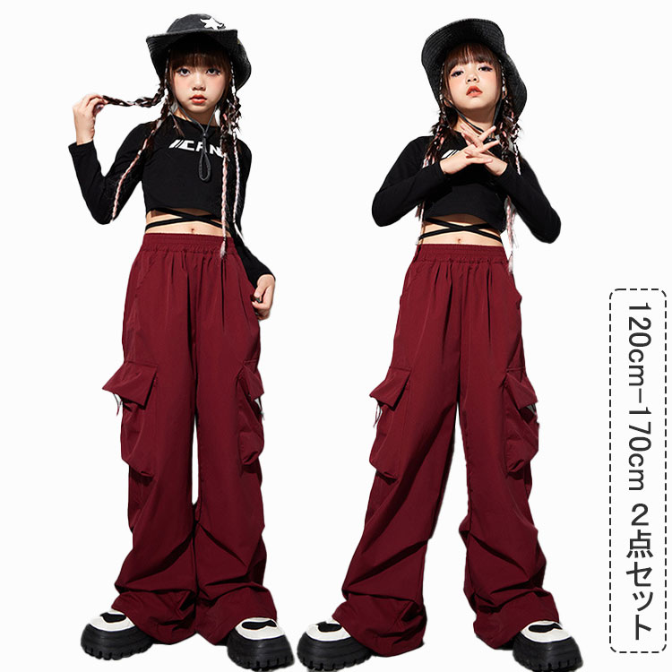 ダンスウェア 2点セット 女の子 へそ出し キッズ 長袖 Tシャツ カーゴパンツ ダンス衣装 ヒップホップ ストリートダンスジュニア 子供服 おしゃれ チームダンス hiphop K-pop 演出服