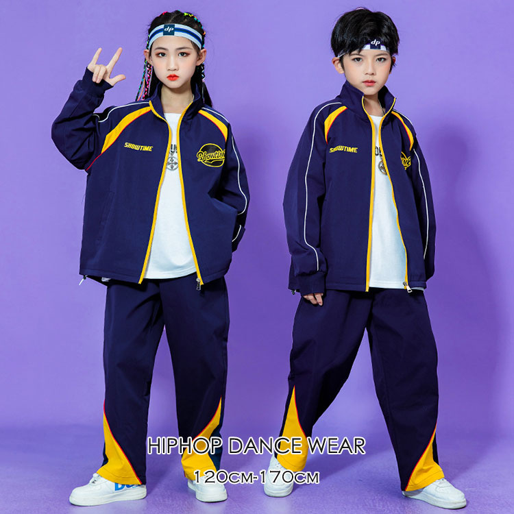子供服 ダンス衣装 男の子 女の子 2点セット 上下セット ヒップホップ ストリートダンス 長袖 ジャケット ロングパンツ ジャージ おしゃれ ジュニア キッズ ダンスウェア セットアップ スウェット