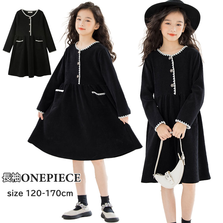 女の子 長袖 ワンピース キッズ 春秋 冬 ブラック ジュニア 120 130 140 150 160 170cm 子供服 フォーマルワンピース 小学生 中学生 高校生 かわいい 誕生日 プレゼント