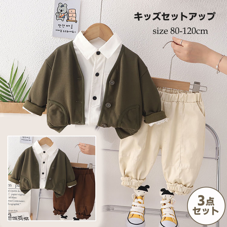 こども服 3点セット 男の子 セットアップ 春秋 上下セット ベビー カジュアル 赤ちゃん キッズ カーディガン 長袖シャツ パンツ かわいい 日常着 やわらかい 着心地いい おしゃれ 80-120c