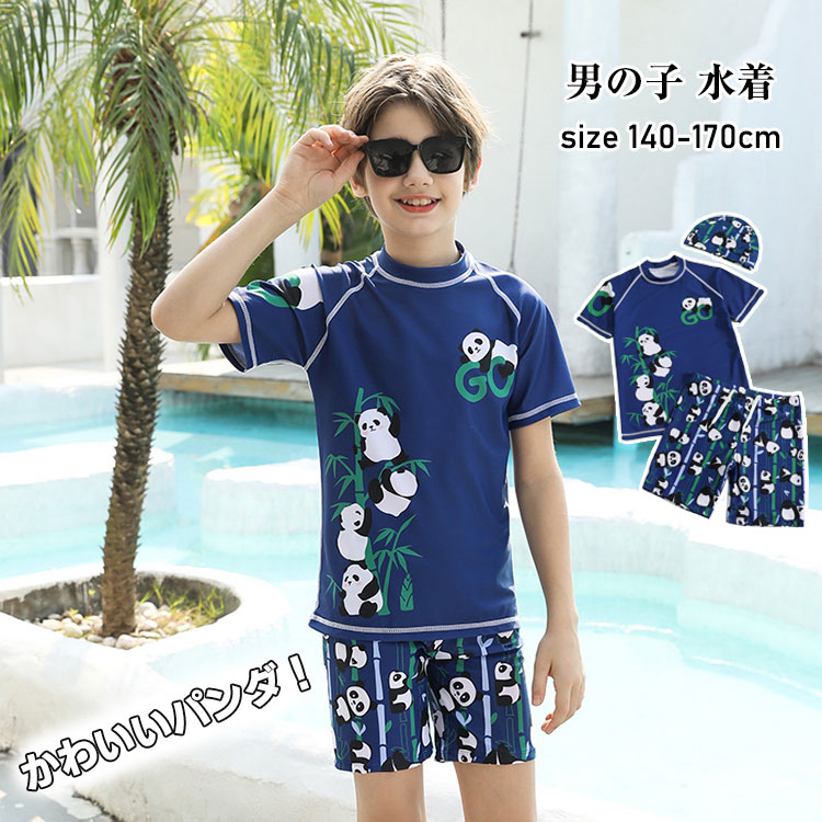キッズ 水着 男の子 セパレート 3点セット 140 150 160 165 170 半袖 かわいい パンダ柄 みずぎ 上下セット ジュニア トップス キャップ パンツ 子供水着 スイムウェア ネイビ