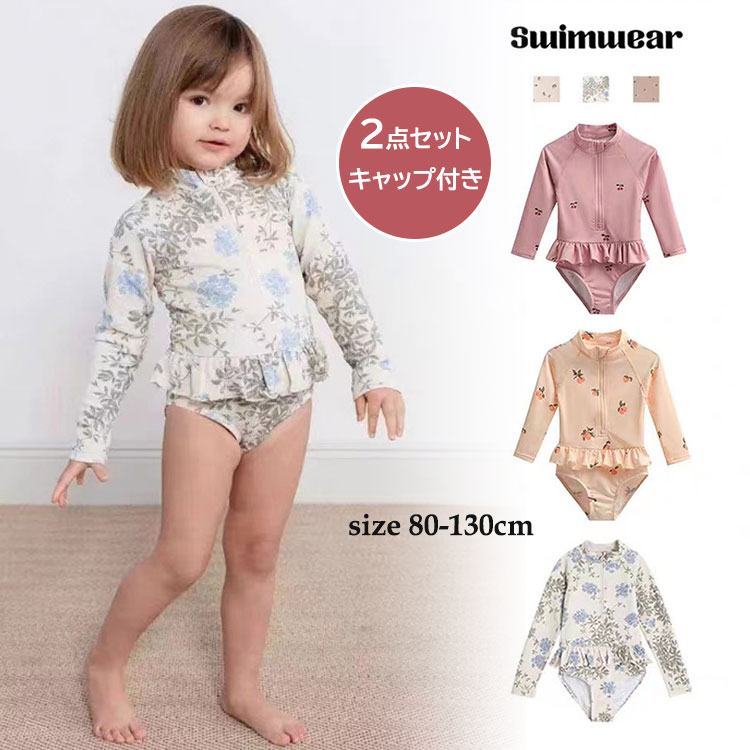 ベビー水着 女の子 オールインワン 2点セット キャップ付き 赤ちゃん 水着 女児 ラッシュガード 日焼け防止 紫外線対策 子供 キッズ かわいい スイムウエア 露出控えめ 80 90 100 110