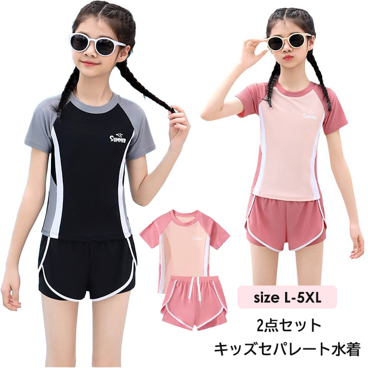 子供水着 セパレート 2点セット スクール水着 半袖 女の子 ジュニア ガールズ トップス ショートパンツ 裏地付き 100 110 120 130 140 150 160 170cm パッド付き か