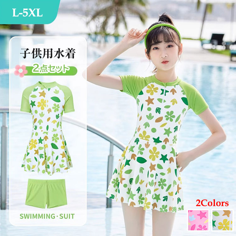子供水着 ワンピース 2点セット 半袖 女の子 ジュニア ガールズ ショートパンツ付き 110 120 130 140 150 160 165 ピンク グリーン パッド付き かわいい スイムスーツ ス