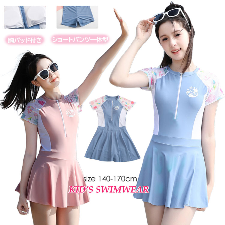子供用 水着 ワンピース 140 150 160 165 170 半袖 女の子 ショートパンツ付き 一体型水着 パッド付き ジュニア ガールズ キッズ スイムウェア かわいい ビーチ 海水浴 海遊び