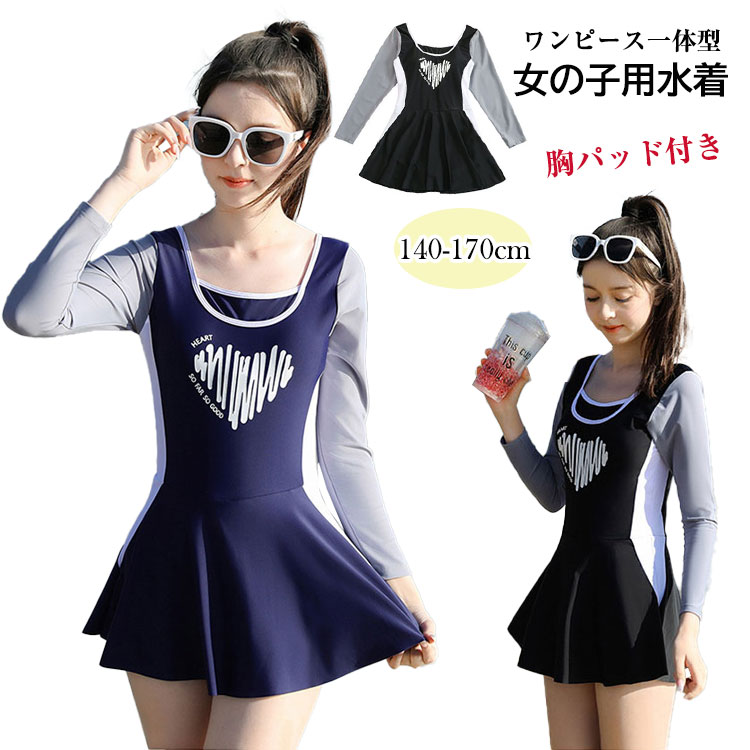 長袖 ワンピース水着 女の子 ショートパンツ付き 一体型水着 140 150 160 165 170 ブラック ネイビー パッド付き ジュニア キッズ スイムウェア スクール水着 シンプル 学校 プー
