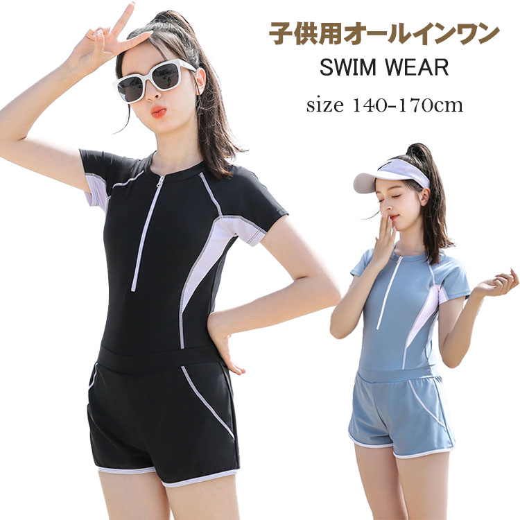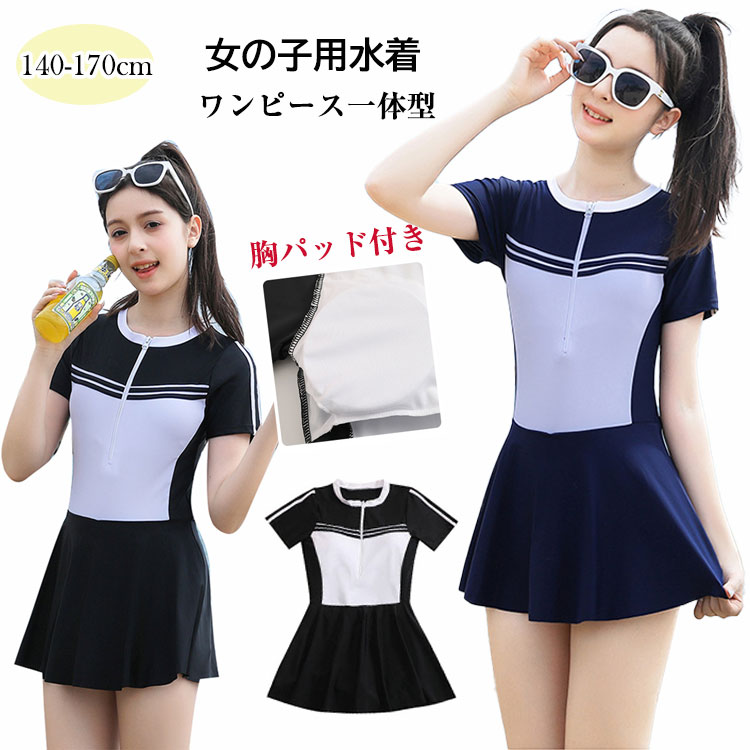 オールインワン水着 女の子 140 150 160 165 170 半袖 UVカット スクール水着 ブラック ブルー パッド付き ファスナー付き ジュニア キッズ スイムウェア プール 水泳 海水浴