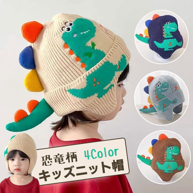 子供用 ニット帽 帽子 男の子 女の子 恐竜柄 かわいい 耳当て付き 裏地あり 防風 防寒 保温 通気性 通園 通学 アウトドア 誕生日 クリスマス プレゼント 4色 ネイビー ブルー ベージュ コー