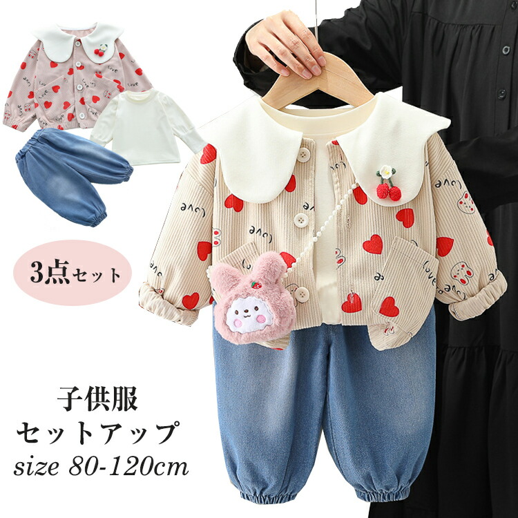 子供服 女の子 春秋 セットアップ 3点セット ベビー服 かわいい 上下セット 80 90 100 110 120cm デニムパンツ キッズ 重ね着 ガールズ カジュアル 幼稚園 保育園 誕生日 プレ