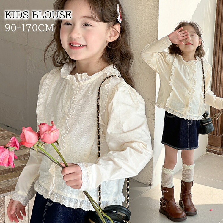キッズ ブラウス 女の子 子供服 シャツ ベージュ 長袖 春秋 レース付き 立ち襟 トップス 無地 ジュニア 90 100 110 120 130 140 150 160 170cm 姉妹コーデ 通園