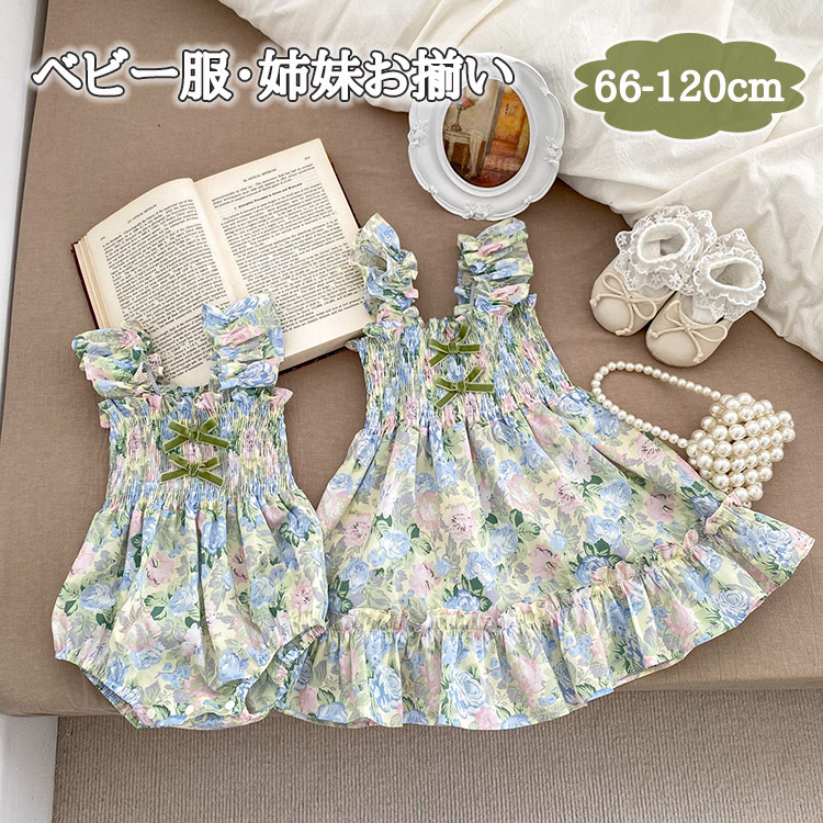 ベビー服 ロンパース ワンピース 夏 ノースリーブ 姉妹コーデ 姉妹リンクコーデ お揃い 66 73 80 90 100 110 120cm お花柄 フリル付き キッズ 女児 子供服 子ども服 赤ちゃ