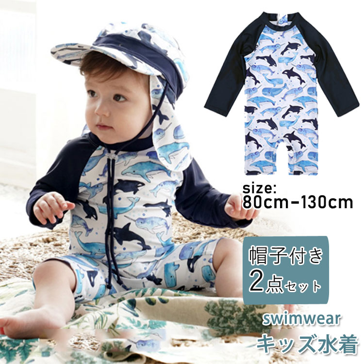 2点セット おしゃれかわいい夏っぽいデザイン ベビー水着 子供用 赤っちゃん 男の子 ワンピース キャップ付き スクール水着 90 100 110 120 130