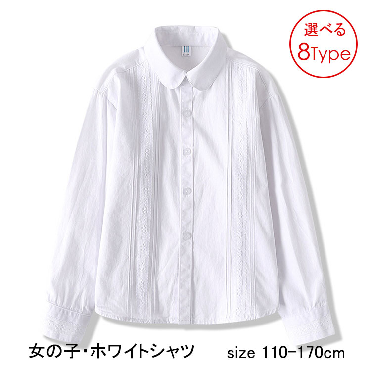 女の子 ホワイト 白 シャツ スクールシャツ 長袖 レース付き かわいい 学生 制服 ガールズ 110 120 130 140 150 160 170 ボタンシャツ コットン 形態安定 子供シャツ 入