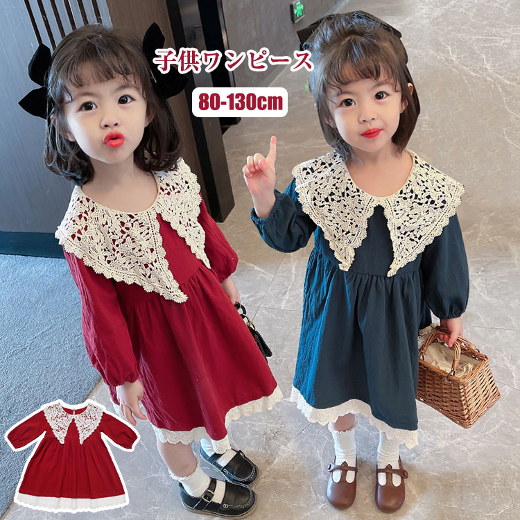 子供服 ワンピース レース襟 可愛い ベビー 女の子 長袖ワンピース ベビー服 姉妹コーデできる ドレス 日常着 誕生日 プレゼント キッズ 女児 80 90 100 110 120 130cm ブル