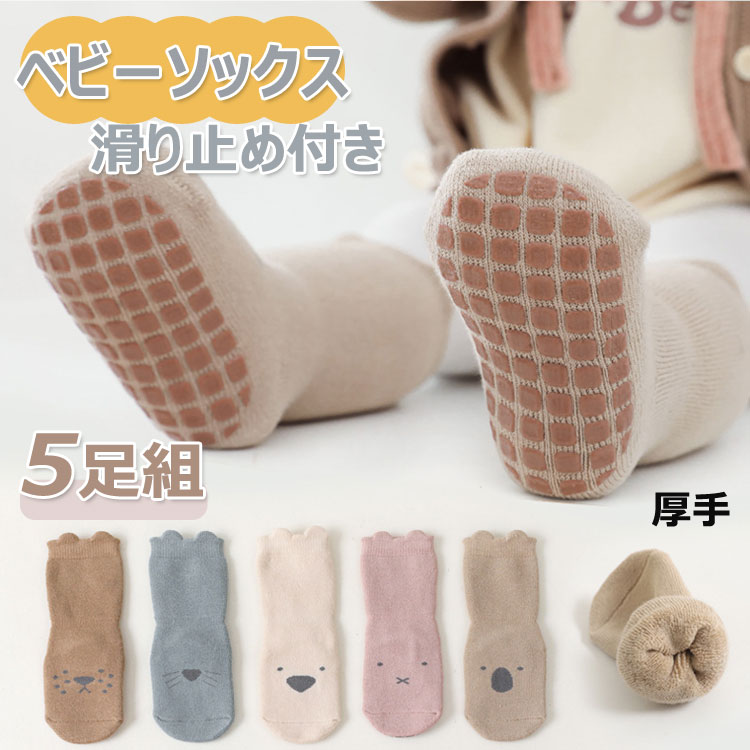 5足セット ベビー 靴下 滑り止め付き キッズ ソックス 女の子 男の子 厚手 ふわふわ 赤ちゃん靴下 子供 おしゃれ かわいい 練習靴下 男児 女児 コットンくつした 保育園 幼稚園 通園 通