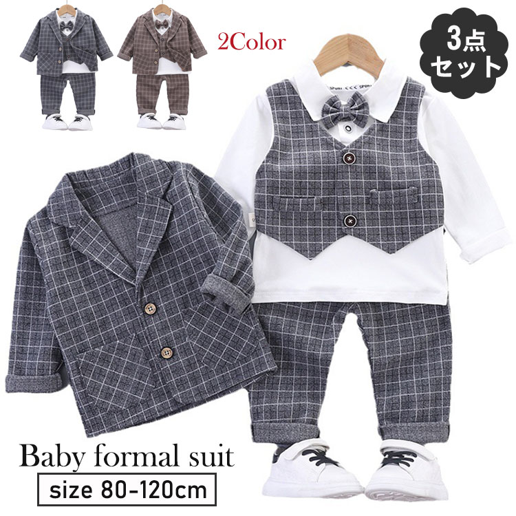 ベビースーツ 男の子 3点セット 男の子スーツ 紳士服 チェック柄 キッズ フォーマルスーツ 春秋 冬 ジャケット シャツ ズボン セットアップ服 上下セット おしゃれ 七五三 結婚式 発表会 入園式