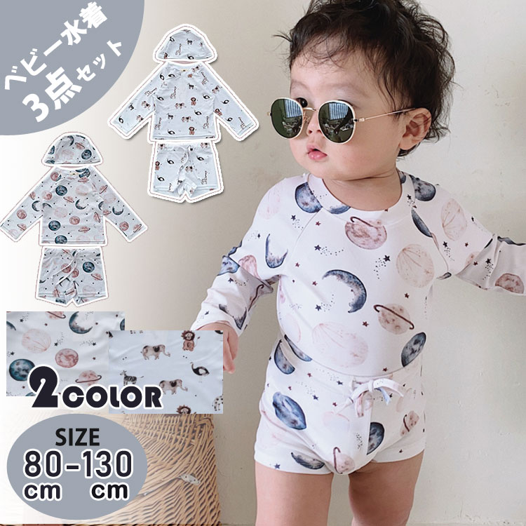 おしゃれでかわいい子供水着 キャップ付き 3点セット ベビー水着 男の子 セパレート 長袖 紫外線対策 宇宙 動物柄 海 川 80 90 100 110 120 130