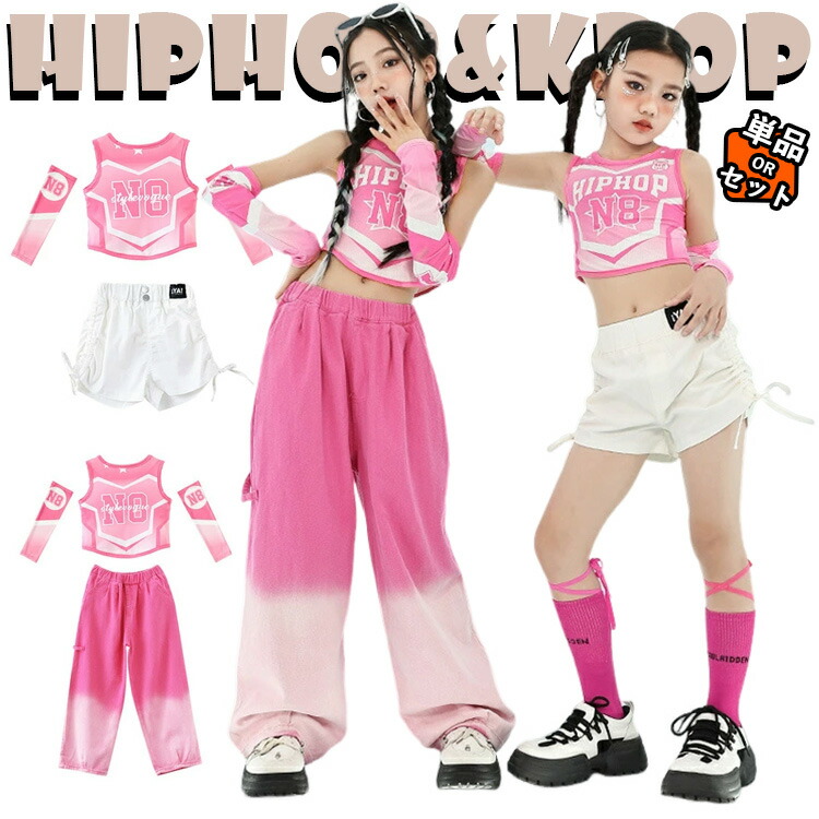 チアガール へそ出し ピンク キッズ ダンス衣装 セットアップ 女の子 ホット パンツ タンクトップ 腕カバー カーゴパンツ ワイドパンツ かっこいい かわいい おしゃれ 演出服 発表会