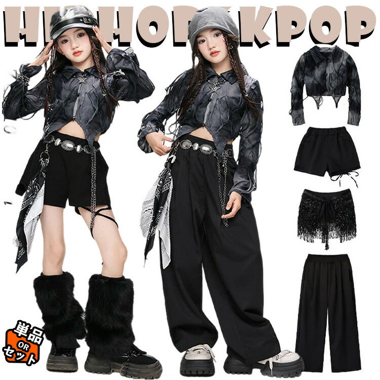 パンク系 チア チアガール 上下セット 長袖 ショートトップ 半ズボン ワイトパンツ 春夏 秋 黒 灰 女の子 キッズ ダンス衣装 3点セット キラキラ スパンコール 飾り 足カバー ジャズ