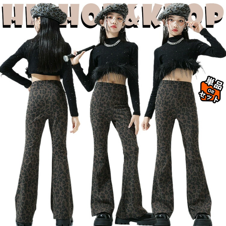 ヒョウ柄パンツ ショートトップ 上下セット 長袖 へそ出し カジュアル ぴったり 女の子 チア チアガール インナー キッズ ダンス衣装 セットアップ ジャズダンス jazz 韓国K-POP HIPH