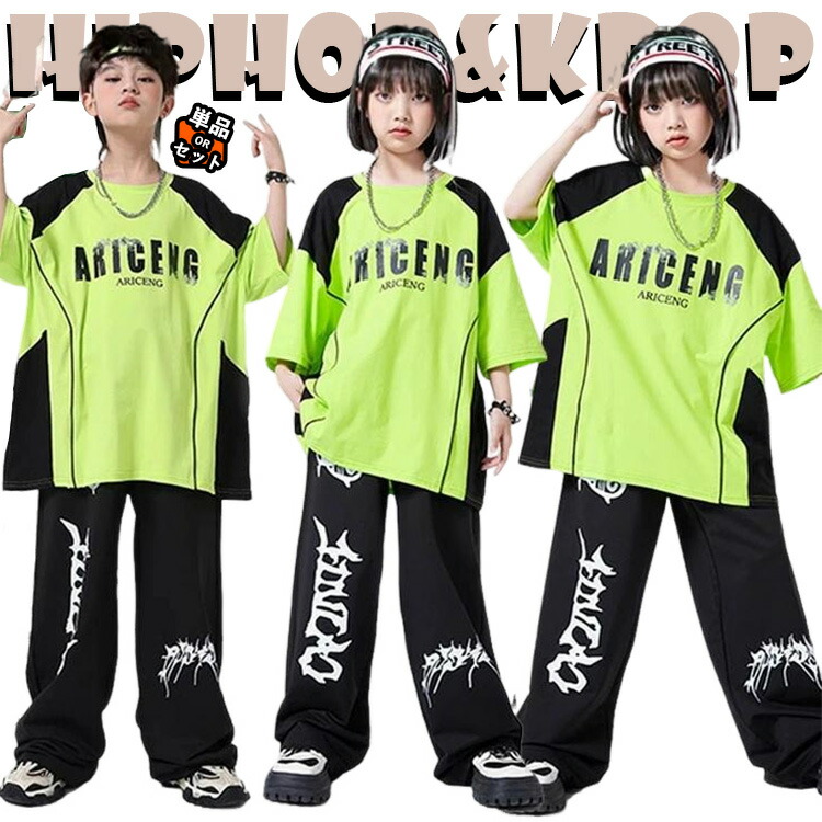 レーシング ゆったり スウェットパンツ キッズ ダンス衣装 黒 緑 シャツ 半袖 女の子 男の子 上下セット セットアップ トップス パンツ カジュアル ヒップホップ ジャズダンス ポッ