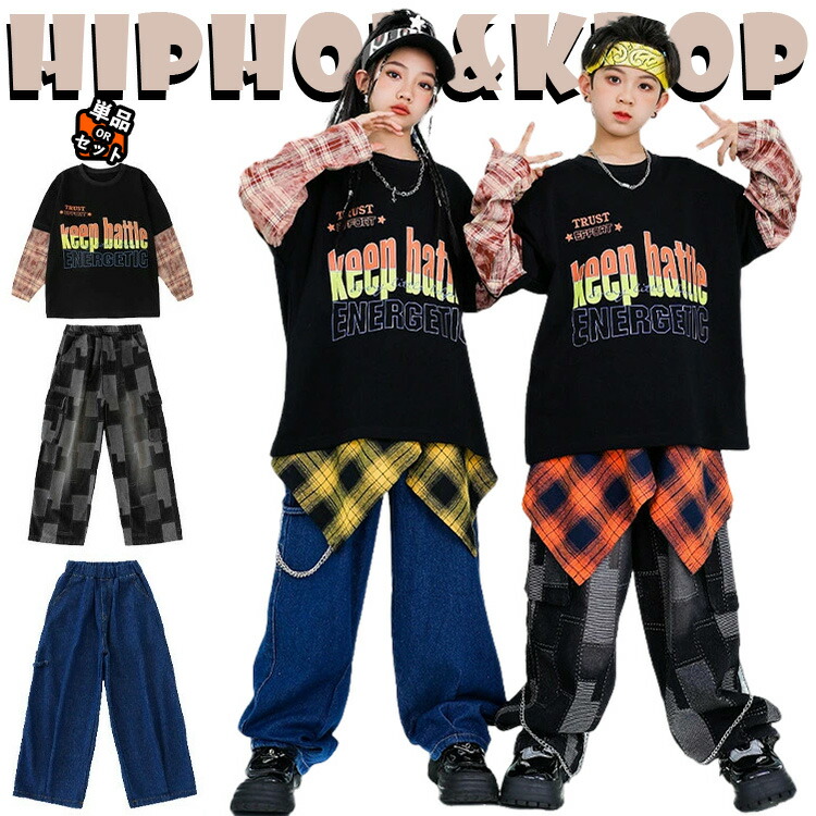 キッズ ダンス衣装 上下セット スウェット デニムパンツ セットアップ チェック柄 長袖トップス ワイドパンツ 女の子 男の子 韓国K-POP HIPHOP jazz ヒップホップ 中学生 発表会 練