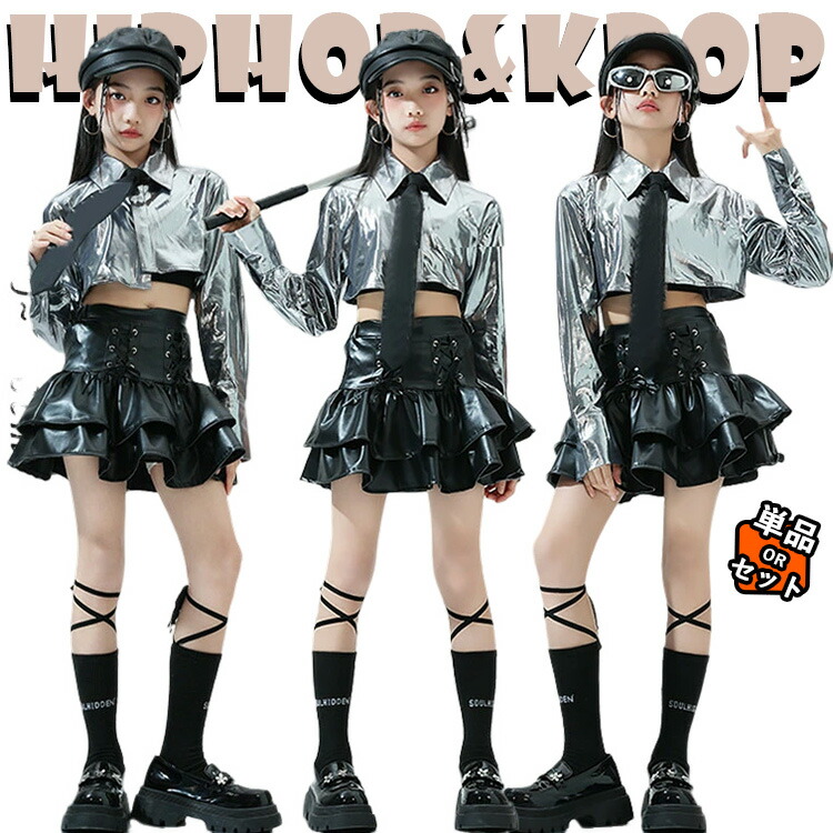 シルバー jazz チア チアガール 女の子 上下セット ショートトップ PU レザースカート 長袖 ハイウエスト へそ出し シャツ ミニスカート キッズ ダンス衣装 セットアップ ジャズダン