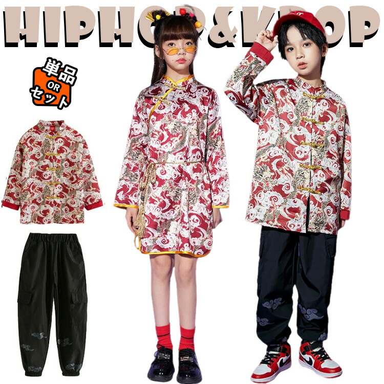 レッド チャイナドレス 唐装 中華風 黒 パンツ キッズ ダンス衣装 セットアップ 上下セット おしゃれ 女の子 男の子 ゆったり カジュアル 古典 総柄 トップス ベルト ダンスウエア ヒ