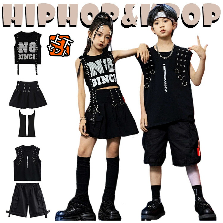 パンク風 黒 キッズ ダンス衣装 セットアップ 女の子 男の子 タンクトップ スカート ショートパンツ ブラック 脚カバー かっこいい かわいい おしゃれ 演出服 発表会 団体服 応援団