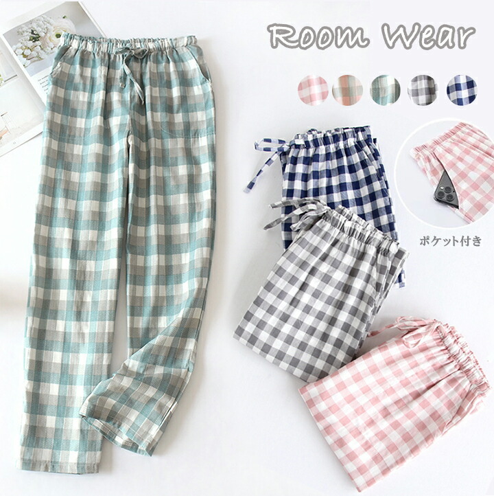 3A43 ポケット付チェック柄 ルームパンツ コットン レディース メンズ チェック 可愛い 春 夏 薄手 綿100%ボトムス ゆったり パジャマ 部屋着 ウエストゴム ガーゼチェック リラッ 寝巻き