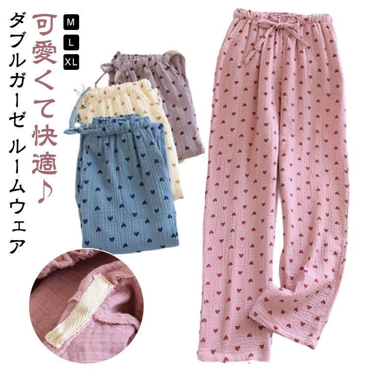 ゆったり 薄手 ルームウェア 綿100% リラックスタイム パジャマ ナイトウェア ハート パターン コットン100% ルームパンツ レディース ダブルガーゼ 部屋着 寝間着 ウエ 調節紐