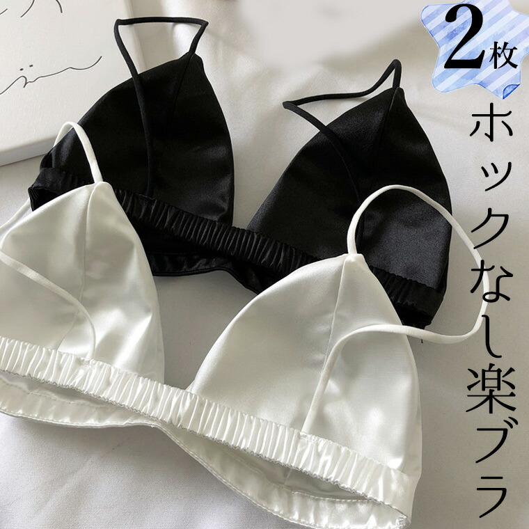 2枚セット ホックなし盛らない楽ちん三角ブラ シンプルブラ ワイヤーレス ノンワイヤーブラ サテン 背中みせ おしゃれ ブラレット やわらか リラックス 楽ちん カップ取り外し ストレッチ
