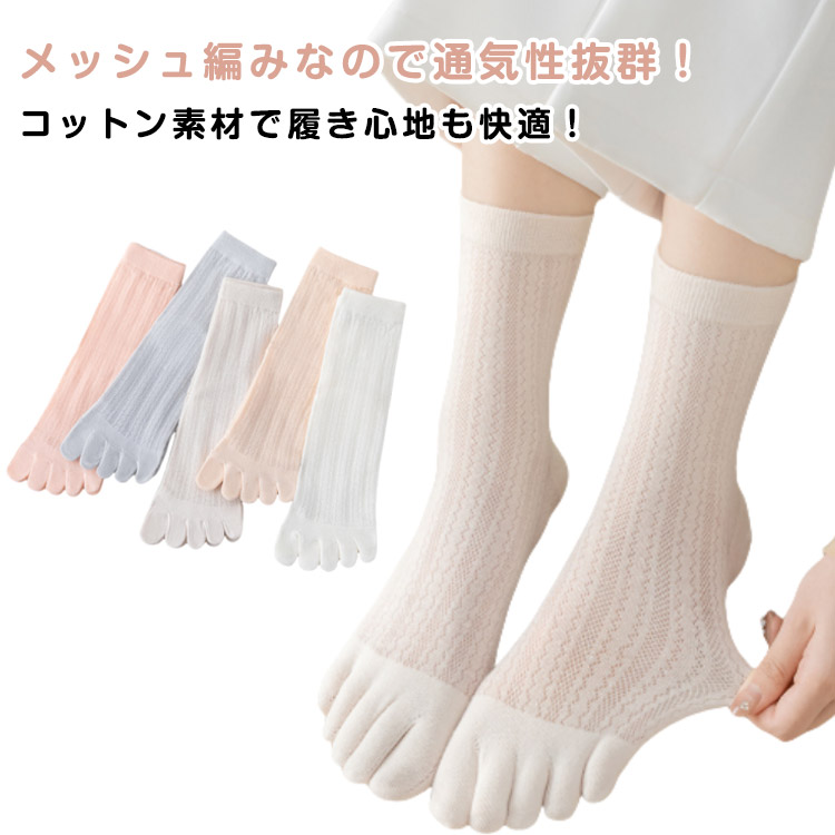 夏用 レディース シンプル 薄手 通気性抜群 靴下 メッシュ 綿 コットン 足指 ホワイト 同色 異色5足セット 吸汗 クルーソックス 無地 五本指靴下 おしゃれ 楽ちん 臭わない 蒸れな スニーカー