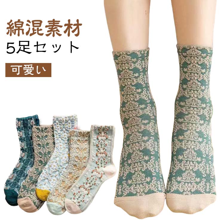 レディース 華やか 吸湿性 靴下 ソックス 綿混 レトロ 通気性 春秋 柄付き コットンソックス 夏 滑り止め ファッション小物 立体 冬 女性 コットン オールシーズン 可愛い クルー